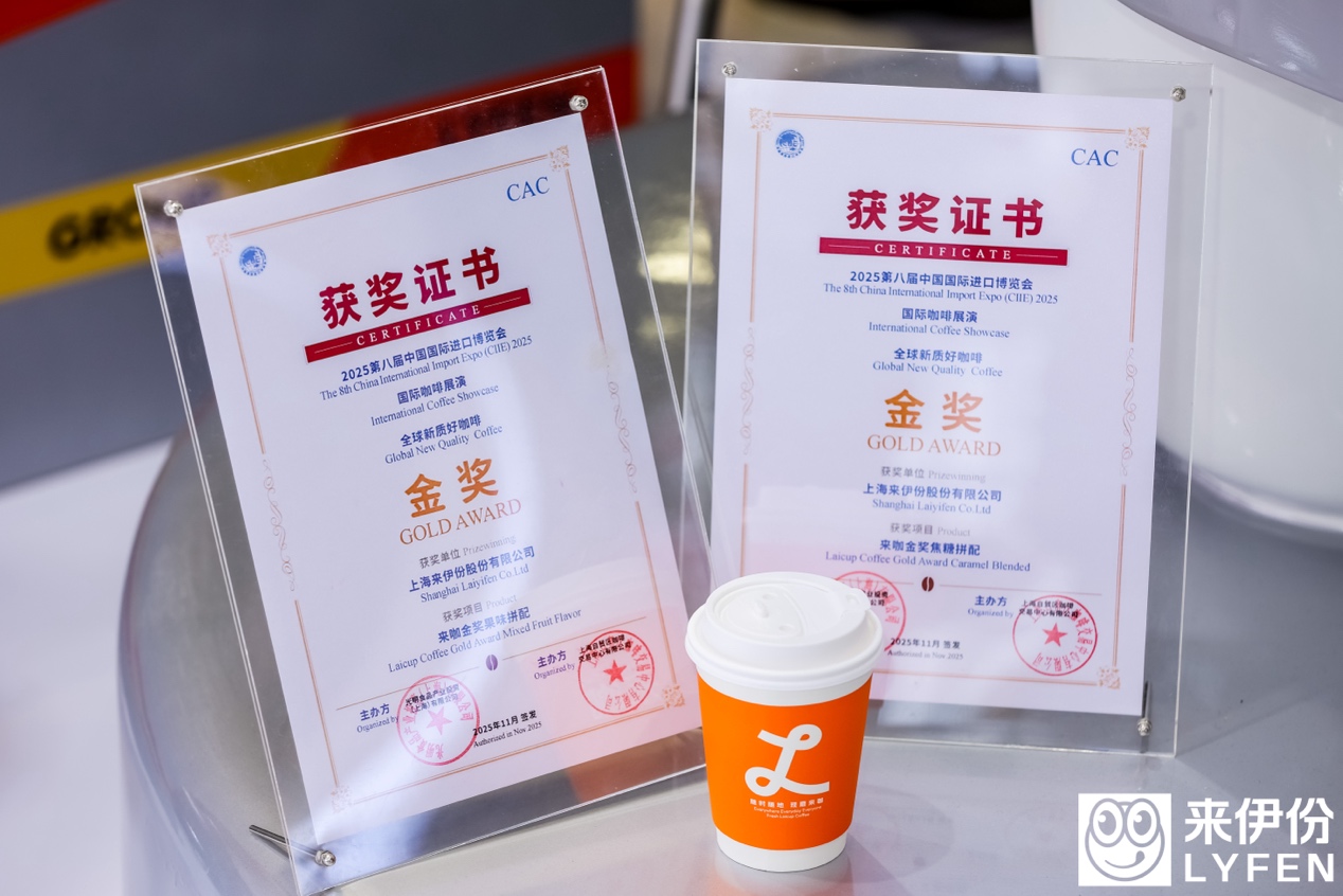 11月6日,2025第八届我国国际进口博览会——国际咖啡展演系列行动之“光明全球新质好咖啡”评选正式启幕。来伊份旗下咖啡品牌“来咖”首次亮相即斩获双金,两款参赛产品“焦糖拼配”与“果味拼配”均荣膺金奖。这不但是对“来咖”品质的权威认证,更是来伊份在进博会交出的第一份亮眼“跨界成绩单”。